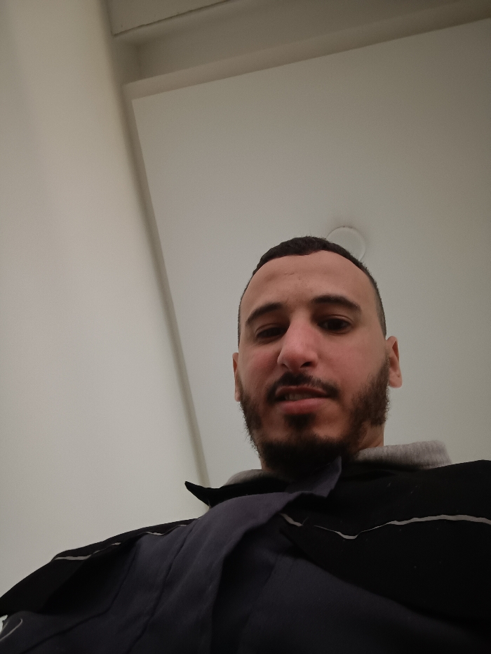 A man with short, dark hair and a beard gazes down at the camera. He is wearing a black and navy jacket with a gray hoodie underneath. The background consists of a plain, white wall and ceiling. The lighting is even, casting no strong shadows on his face. The man's expression is neutral, with slightly furrowed eyebrows.