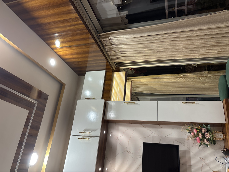 A contemporary interior features a white wall with a dark brown geometric pattern, a glossy wood ceiling with recessed lighting, and white cabinets with gold handles. The wall has a patterned wallpaper underneath the cabinets, where a television is centered. Curtains cover a window, letting in some light, and a decorative flower arrangement sits on the right side of the television.