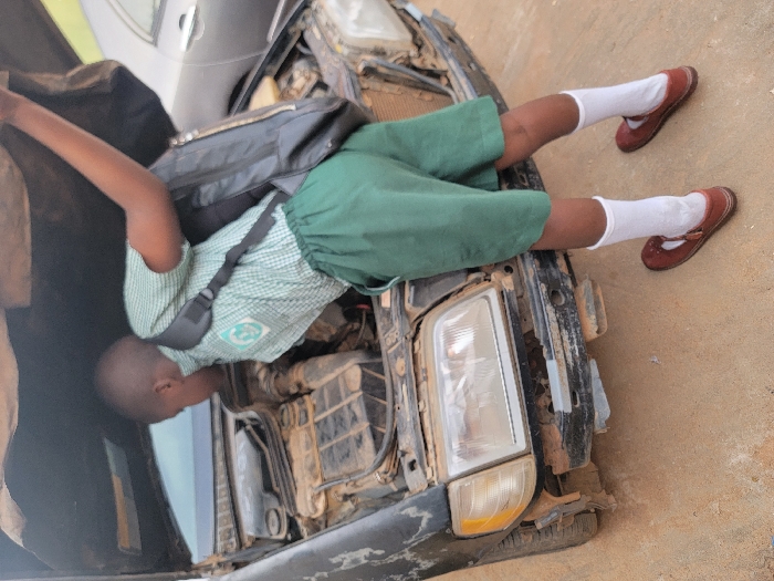 An individual, likely a child, wearing a light green and white striped short-sleeved shirt, green shorts, white socks, and brown shoes, with a black backpack slung over the right shoulder, is depicted bending over the open hood of a dark-colored sedan. The person's head and torso are positioned inside the engine compartment, appearing to examine the engine or related components. The vehicle, an older model with distinctive headlights suggesting a Mercedes-Benz C-Class (W202), has visible damage to its front bumper area, including missing sections and rust. The engine bay is dirty, and various mechanical parts are exposed. The scene takes place outdoors on unpaved, brownish-orange ground in Sabon Tasha, Nigeria. A silver vehicle is partially visible in the blurred background to the right.