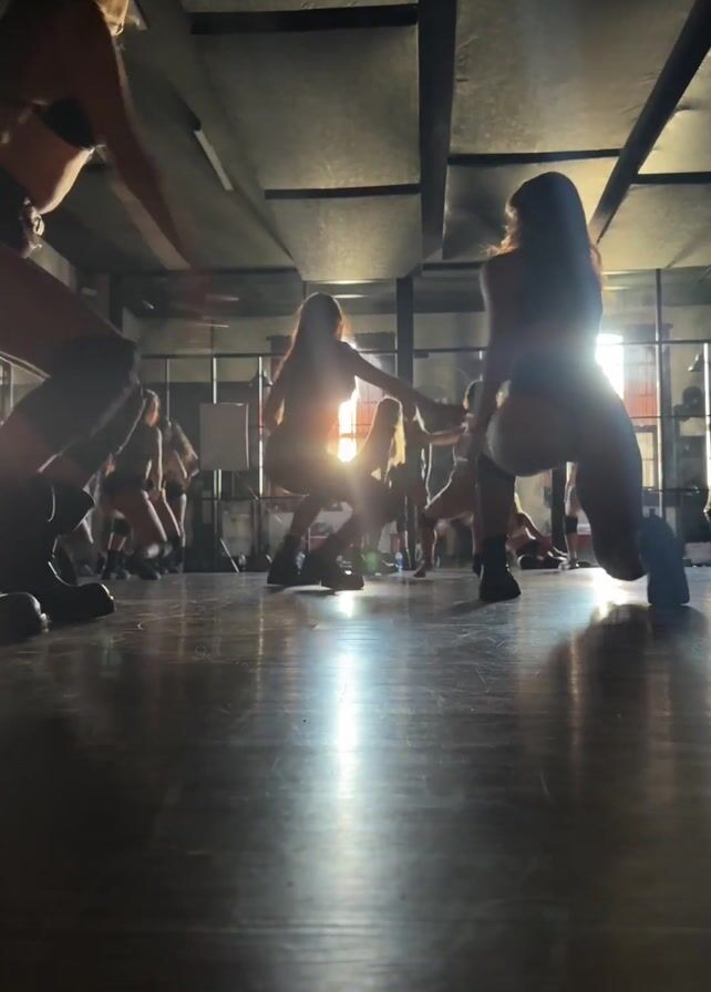 Several women are practicing a dance routine in a dimly lit studio. They are wearing dark clothing, including bras and shorts. The floor is reflective and light shines through a large window at the back of the room, silhouetting the dancers. The dancers move in sync, bending over and straightening up.