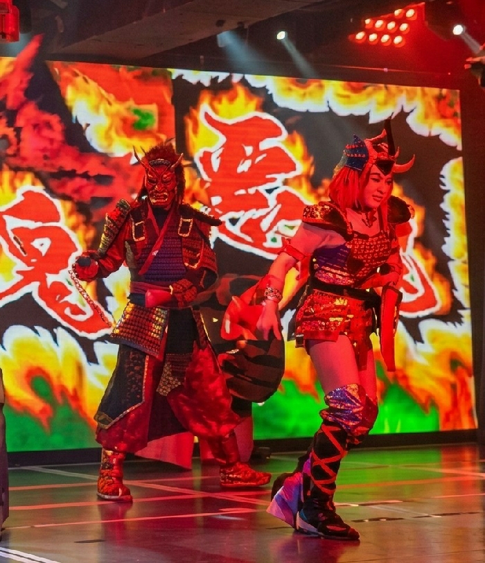 The image depicts two performers in elaborate, Japanese-inspired warrior costumes on a stage within the city of Shinjuku, Japan, likely at a themed entertainment venue