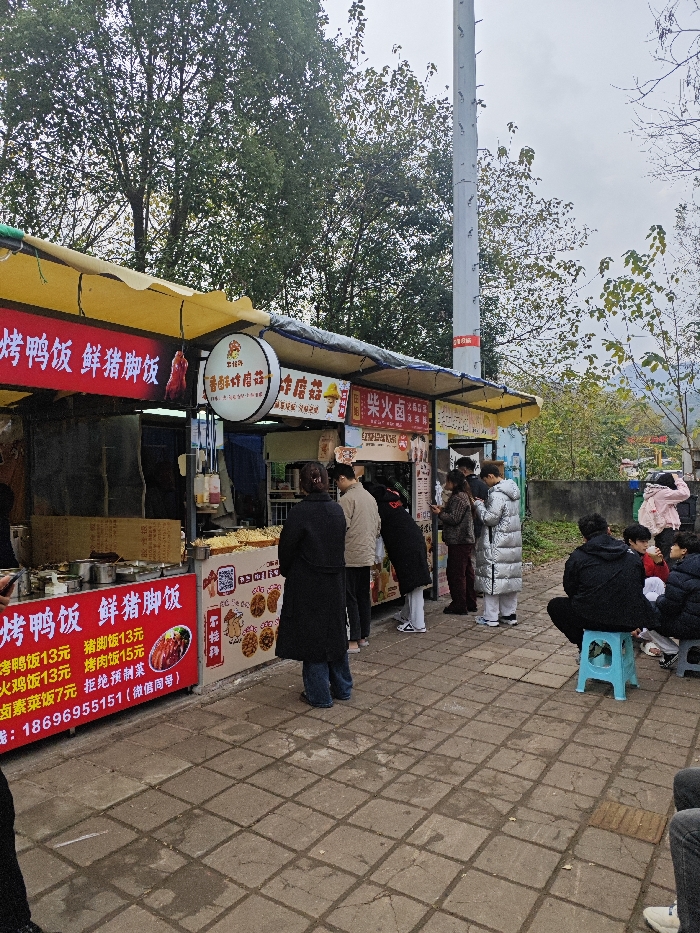 row of street food stalls with yellow canopies and various signs in Chinese. A red sign advertises roasted duck rice and fresh pig's trotters, listing prices. Customers are lined up, waiting to be served. Some are sitting on small stools, while others are looking at their phones. In the background, there are trees and a tall pole, suggesting an outdoor setting.