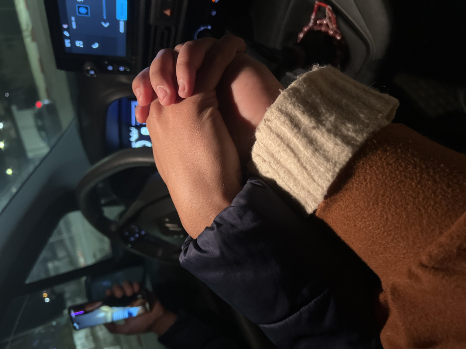 A couple holds hands inside a vehicle at night. One person wears a brown coat with a cream-colored knitted cuff, while the other wears a dark blue jacket. A steering wheel and a digital display are visible in the background. A hand holding a phone is also seen in the reflection in the driver's side window.