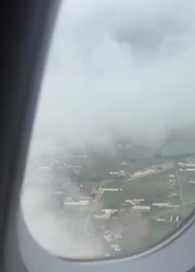 view from an airplane window. The sky is overcast with heavy clouds. Below the clouds, a town or city is visible, with buildings and green spaces. The camera is static and focused on the view outside the window.