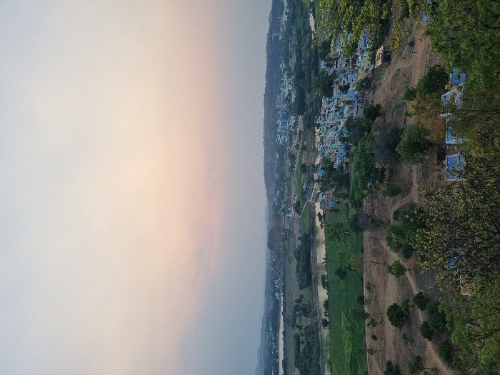 An elevated, wide-angle landscape image captures a portion of Koyalaguttapalli, India, at what appears to be either dawn or dusk, evidenced by the ambient lighting. The top third of the frame is occupied by a clear sky, transitioning from a light blue at the zenith to a subtle peach-pink hue near the horizon line. The foreground, occupying the lower third, features a sloped terrain densely covered with various green foliage and trees, indicating the vantage point is from a natural elevation. Below this immediate tree cover, the ground is primarily arid, light brown earth, interspersed with numerous smaller green trees and defined dirt paths winding through the landscape. Several small, low-lying structures with light blue or white flat roofs are partially visible among the trees on the lower right, suggesting residential or utility buildings. The midground reveals a village cluster situated on a relatively flat area. This cluster consists of multiple compact, single to two-story buildings, many painted in shades of light blue and yellow. To the left of the village, a significant body of water, possibly a river or reservoir, is visible, its surface reflecting a muted light. Agricultural fields, predominantly green, border this water body and extend towards the village, separating it from additional scattered green areas and further development in the distance. Another smaller, brownish body of water is located further left. Beyond the initial village, more densely constructed areas with larger buildings are discernible, indicating urban expansion. The background presents a hazy horizon line with distant, undulating hills or low mountains, partially obscured by atmospheric conditions. No individuals or specific actions are discernible within the frame.
