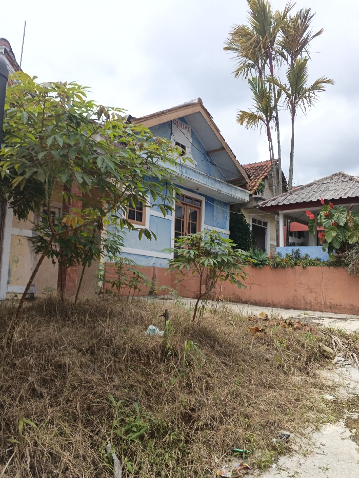 A blue house with brown window frames sits adjacent to another dwelling, both behind overgrown, brown vegetation. The blue house has a sign reading "DIJUAL". Palm trees rise behind the second house, which features red flowers and a tiled roof. The sky is overcast and gray. Litter is visible within the unkempt foreground growth. The scene suggests a property in need of maintenance or possibly for sale.