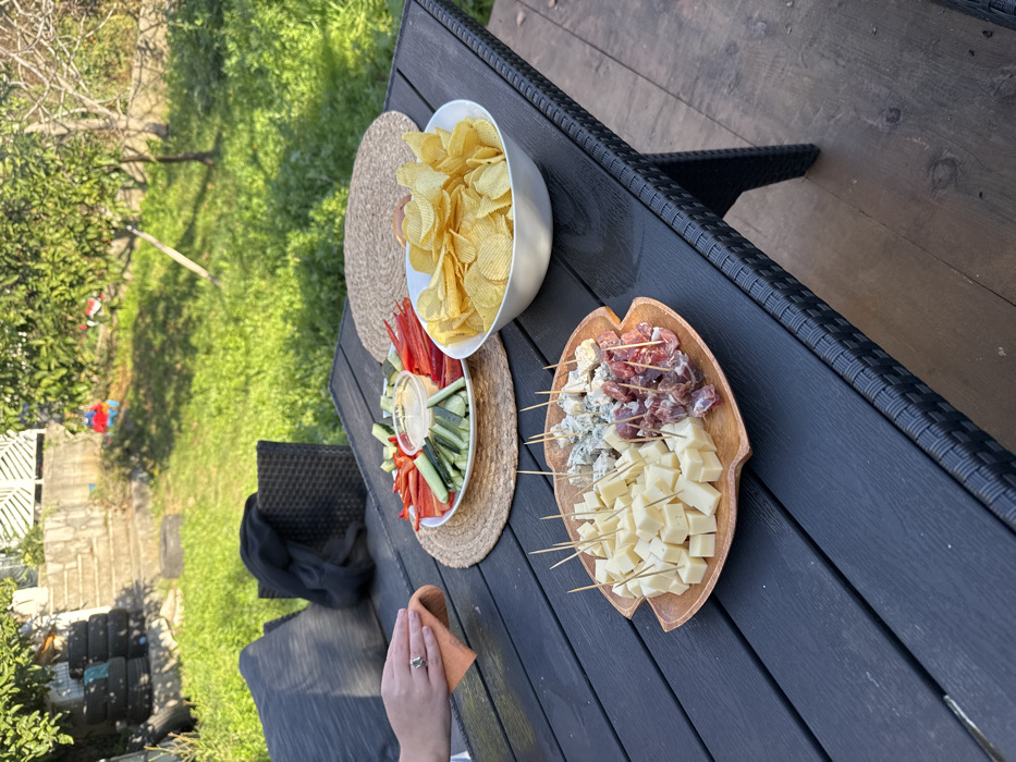 An outdoor scene is depicted on a sunny day in Donji Pobori, Montenegro, focusing on a dark, slatted outdoor dining table set with appetizers. On the table, a white rectangular plate rests on a round woven placemat, presenting an assortment of red bell pepper sticks and cucumber sticks arranged around a central clear plastic cup containing a light beige dip. Adjacent to this, a large white bowl is filled with ridged potato chips. A wooden, leaf-shaped plate occupies the foreground, sectioned into three distinct offerings, each containing cubed items with toothpicks: light-colored cheese, blue cheese, and dark red cured meat. To the left, a human left hand, wearing a ring on the ring finger, holds an orange-colored cloth on the table surface. A black outdoor seating cushion is visible on a black woven chair or sofa to the immediate left, with a black garment draped over it. The background shows a sunlit green lawn with various trees and foliage. Stone steps ascend on the far left, near which several dark tires are stacked. The table is positioned on a dark wooden or composite deck.