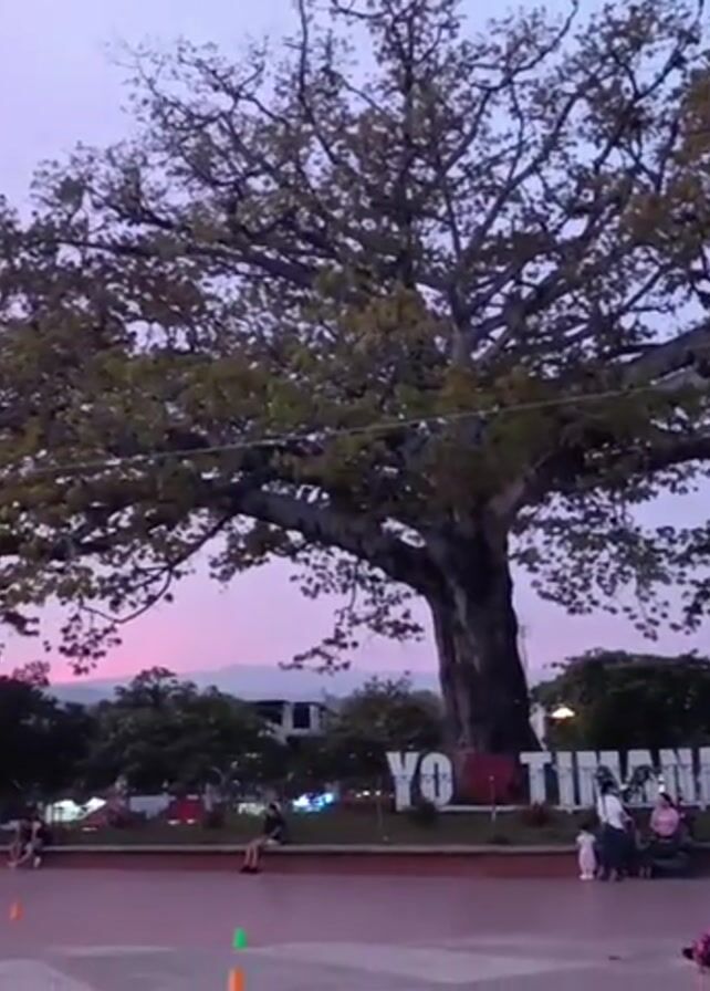 The camera pans up from a ground-level shot of a large tree, a sign that says “YO TIMANA”, and some people sitting on a ledge to a view of the sky at dusk, with light pink clouds. In the foreground, small green and orange cones are placed on the ground. In the background, there are buildings and mountains.