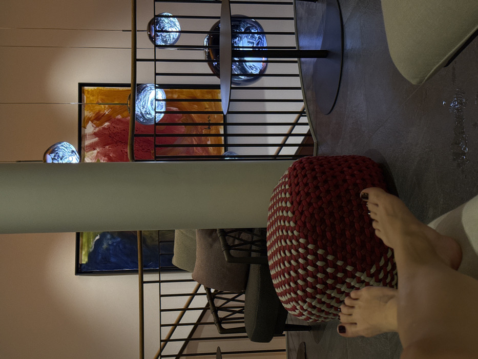 A low-angle shot captures a modern interior. A red and white pouf sits beside bare feet with dark nail polish. A black metal stair rail is visible behind it, along with hanging spherical lights and two framed abstract paintings, one with red and yellow hues, and the other with blue tones. The shot includes a minimalist metal table and a light-colored chair in the upper right corner. A neutral column is placed in the left side.