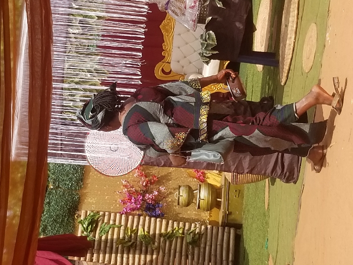 In Ochadam, Nigeria, an adult individual, viewed from the back, walks from left to right across a decorated outdoor event setting. The person, with dark skin and dark dreadlocks partially covered by a patterned green and dark headwrap, wears a traditional two-piece garment in maroon, grey, and black geometric patterns, featuring a golden patterned waistband. A light grey clutch bag hangs from their left arm, and a small, rectangular, brown container is held in their right hand. Light-colored open-toed slippers are worn on their feet, with the right slipper appearing partially dislodged. The immediate foreground is a light brown, possibly earthen surface, transitioning to a green carpet or artificial turf further back. Overhead, brown and orange fabric drapes form a canopy. The decorated backdrop features, from left to right: a maroon fabric panel; a vertical bamboo slat structure with green foliage; a golden-toned wall adorned with clusters of pink, purple, and yellow artificial flowers. Below the flowers, two stacked golden, lidded vessels rest on a dark base, with a dark green trunk-like object visible beneath. A large white, circular, woven decorative element is centrally affixed to the golden wall. To the right, a vertical screen of thin white strings hangs in front of a dark red fabric. Further right, a section of a cream-colored tufted sofa with golden ornate trim is visible, alongside a dark blue/black table draped with green leaves, and a circular woven mat on the green ground.