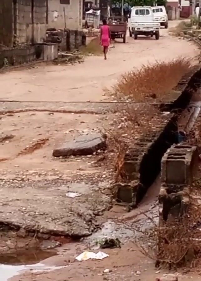 dilapidated dirt road in what appears to be a residential area. A young person wearing a pink dress walks away from the camera, down the road. Two small white pickup trucks are parked further down the road. A shallow, muddy stream flows through a broken section of the road in the foreground. Debris and trash are scattered around the stream and road. Buildings are visible on either side of the road, some of which appear to be in disrepair. Tall vegetation grows along the side of the road.