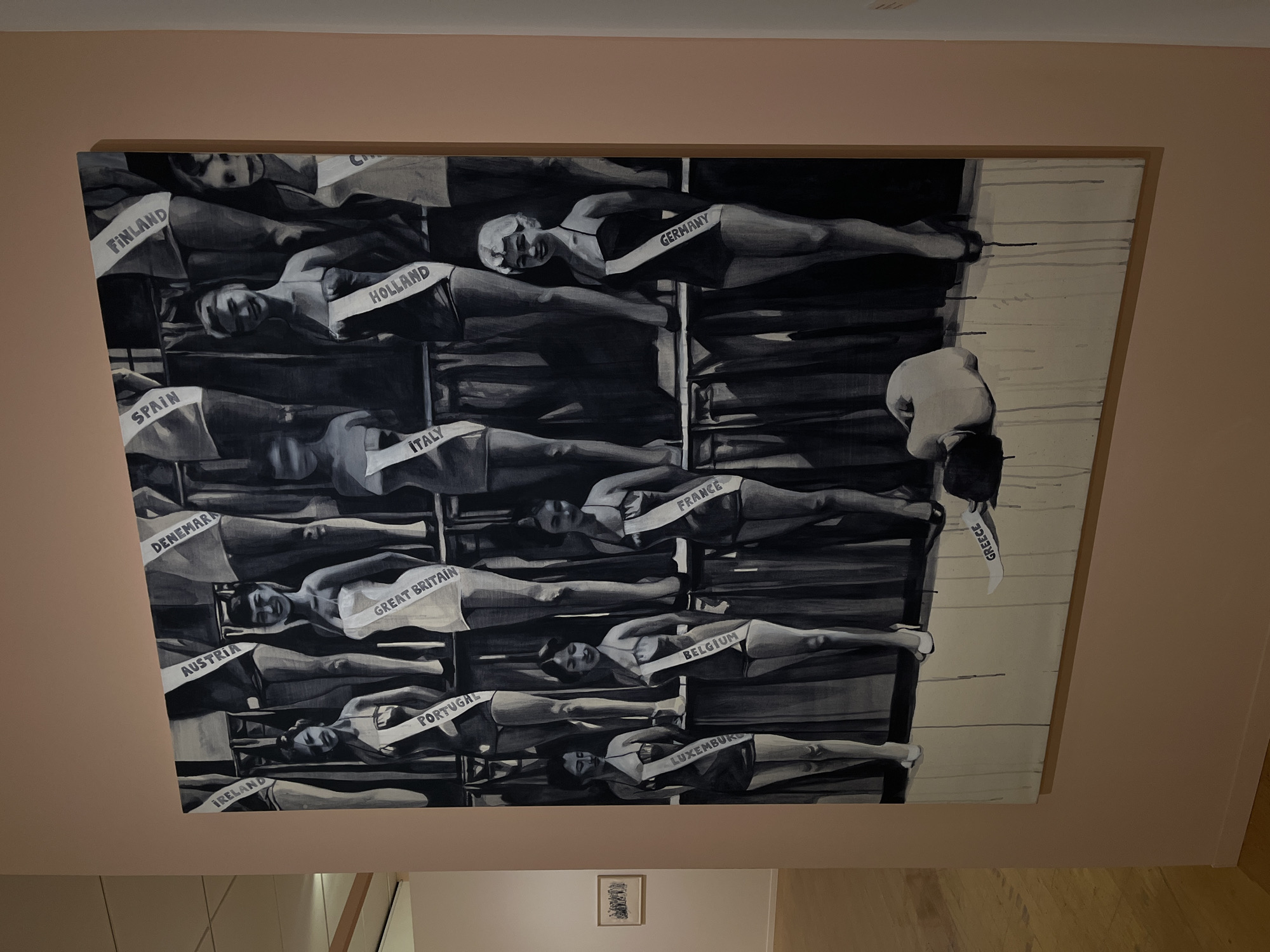 A large, grayscale painting titled "Miss Europe" by Juliette Jouannais is displayed on a pale peach-colored wall within the Musée d'art contemporain de Lyon (macLYON), Lyon, France. The painting depicts multiple female figures arranged in rows, reminiscent of a beauty pageant. The top row, partially visible, shows the legs and lower torsos of women with sashes identifying "IRELAND," "AUSTRIA," "DENMARK," "SPAIN," and "FINLAND." The middle row features four standing women in swimsuits and sashes: "PORTUGAL," "GREAT BRITAIN," "ITALY" (whose face is blurred), and "HOLLAND." Another figure to the far right in this row also has an obscured face. The bottom row displays four full-body figures standing in swimsuits and sashes: "LUXEMBOURG," "BELGIUM," "FRANCE," and "GERMANY." At the bottom of the canvas, distinct from the standing figures, a prone figure labeled "GREECE" lies face down on the painted floor. Dark gray paint drips extend vertically downwards from the base of the platform where the standing figures are positioned, reaching the bottom edge of the artwork. The background within the painting is dark, resembling stage curtains. To the left of the painting, a polished light-colored wooden floor is visible, extending into an adjacent gallery space. In the distance, on a far wall, a smaller, framed artwork depicting a group of figures is discernible. The museum environment is illuminated by ambient overhead lighting.