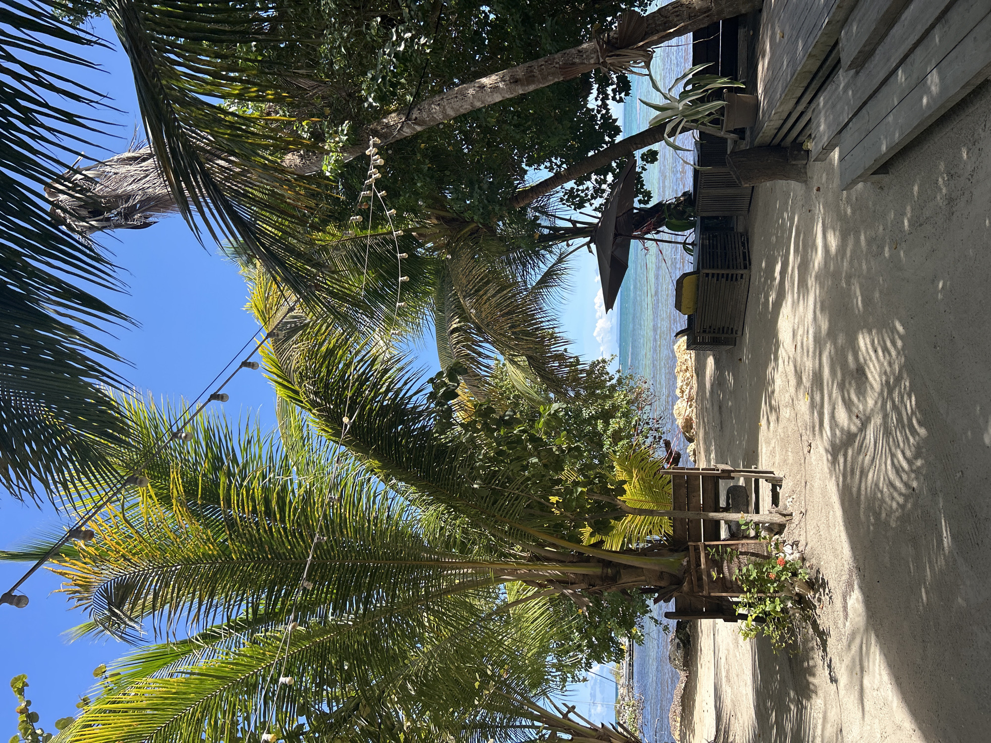 beach scene in Sainte-Anne, France. The foreground features a sandy path with a wooden bench on the right side. The path leads towards the ocean, which is visible in the background. Several palm trees and other vegetation are present, casting shadows on the path. The sky is clear and blue. A structure, possibly a building or elevated platform, is visible on the right side near the ocean. String lights are strung among the palm trees.