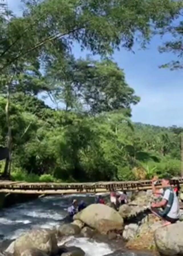 vibrant outdoor scene at a river camping site. People are seen wading in the river that is flowing rapidly over rocks. A wooden bridge spans the river in the background, with more people crossing. On the riverbank, tents are set up under a large tarp. In the foreground, a woman in a hijab plays with a young child in the water. Another child in swimwear is also present, enjoying the river. The setting is lush with green trees and a clear blue sky, suggesting a sunny day in a natural environment.