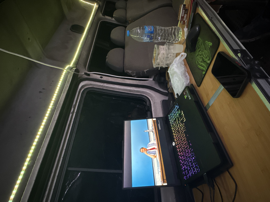 The scene depicts the interior of a vehicle, likely a van or minibus, at night or in low light conditions, located in Chorbadjisko, Bulgaria. A long, illuminated LED strip light is affixed to the vehicle's ceiling, providing ambient illumination. On a light-colored wooden table with a metallic frame, a black gaming laptop with a multicolored RGB backlit keyboard is open and powered on, displaying a screen showing a man with short dark hair, wearing a light-colored shirt and a red tie, seated at a desk against a blue background, with a silver cylindrical object to his right. The laptop rests on a black cooling pad or stand, with cables connected to its left side. To the right of the laptop, a black smartphone with a dark case lies face down on the table. Further to the right, on a green Razer-branded mouse pad, sits a black computer mouse. Adjacent to these items, a clear plastic bottle of "Gorna Banya" mineral water stands upright, next to two stacked white plastic containers, the top one partially filled with what appears to be a snack or food item. A small, clear glass or cup containing a clear liquid is also present. A white, translucent plastic bag is positioned near the food containers. A pack of cigarettes, identifiable by its brown and white packaging, and a small lighter or matchbox are located at the far right edge of the table. The background reveals two rows of grey fabric-covered vehicle seats. The windows are dark, indicating exterior darkness, with some interior reflections visible. The vehicle's interior panels are light-colored and appear utilitarian. No individuals are physically present in the immediate scene, apart from the person depicted on the laptop screen.