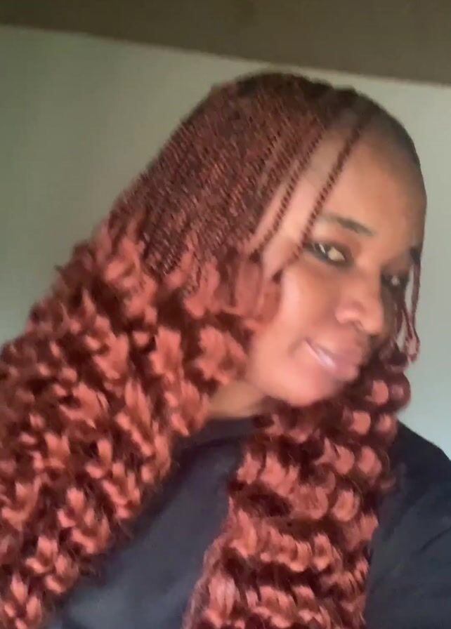 A woman with long, copper-colored braided hair with curly ends is centered in a close-up, selfie-style shot