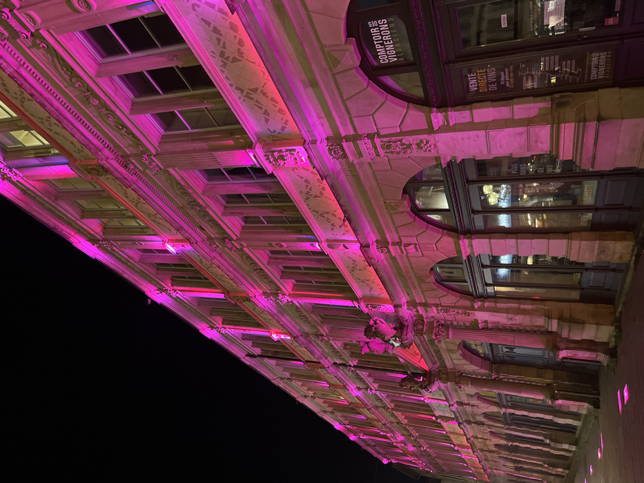 A multi-story historical building, identified as 12 Rue des Hallebardes in Strasbourg, France, is depicted at night. The stone façade is uniformly illuminated by magenta-pink accent lighting, highlighting its classical architectural elements. These details include prominent pilasters, elaborate cornices, and decorative carvings adorning both the main structure and around its numerous rectangular windows on the upper floors. The ground level features several arched storefronts with dark-framed glass doors and windows. One prominent storefront on the right displays the signage "COMPTOIR DES VIGNERONS ALSACIENS" and "VENTE DIRECTE DE VINS." An adjacent window shows text referencing "PLUS GRAND CHOIX DE VINS." The sky above is dark and cloudless. The pavement directly in front of the building exhibits distinct magenta light squares, indicative of recessed ground lighting or reflections from the building's illumination. No individuals, vehicles, or discernible actions are present within the frame.