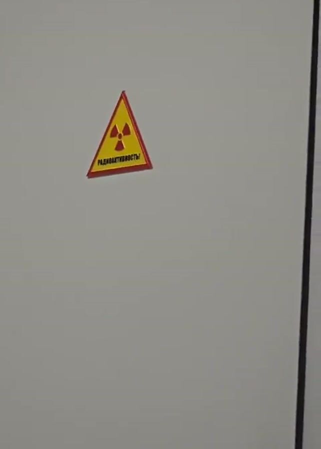 metal door with a radiation warning sign on it. The door is painted a light gray color. The warning sign is a yellow triangle with a red border and a radiation symbol in the center. The sign reads "RADIOACTIVITY" in Russian. Above the door is a red stop sign. The door has a metal strip in the middle and a white handle. The door is located in a hallway with blue walls.