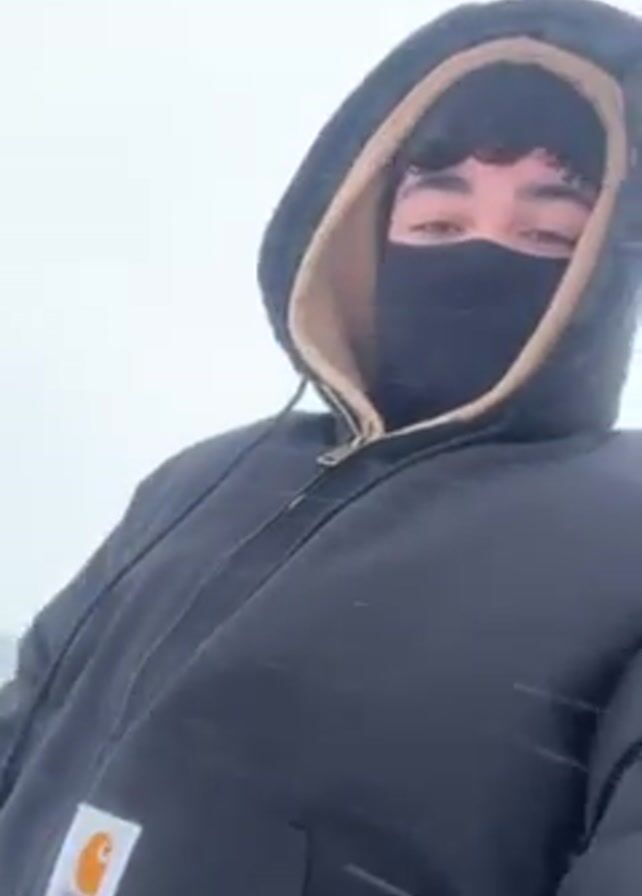 A person wearing a black hooded coat and a black face mask is standing outside in a snowstorm. The coat has a gold-colored zipper and the lining of the hood is a light brown color. The person is facing the camera. The camera moves and the person is now seen from the waist down, standing in a snowy field near a body of water. The person bends down and picks something up. The wind is blowing hard and the snow is falling heavily.