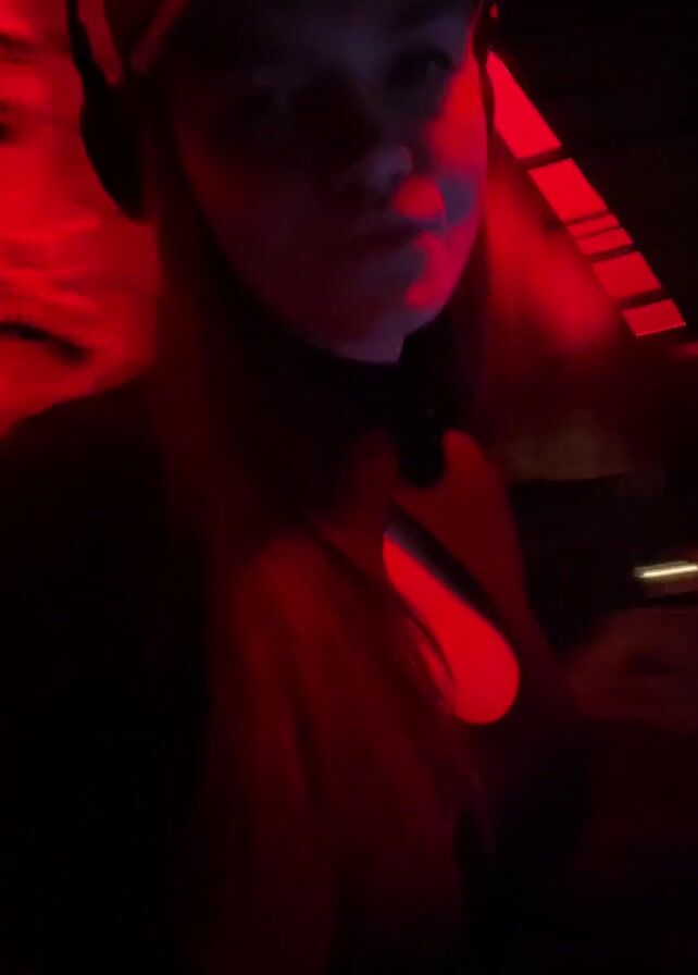A woman in a black top with a teardrop cutout and a red baseball cap is standing in front of a DJ setup in a dimly lit room with red lights
