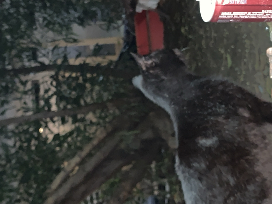 - "A dark-colored cat is positioned close to a red-handled bird feeder, possibly attempting to reach its contents" by FM-Gn7EC2, licensed under CC BY 4.0