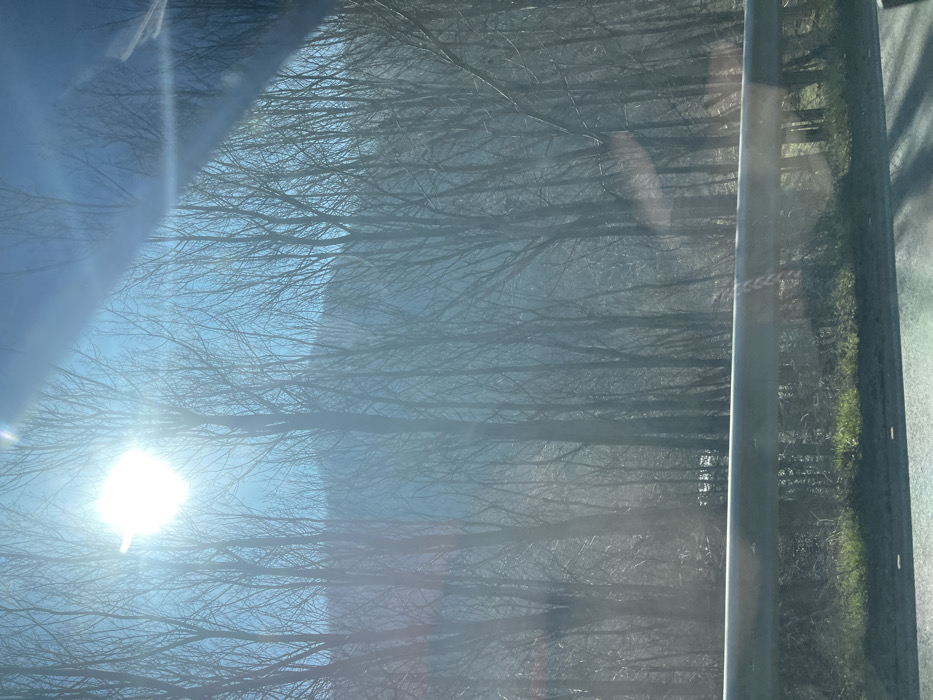 The image displays an outdoor scene in Vetren Dol, Bulgaria, captured from a perspective consistent with looking out of a vehicle window. A brilliant white sun, producing significant lens flare, is positioned in the upper left quadrant against a clear, light blue sky. A dense forest of deciduous trees with bare branches occupies the mid-ground, extending towards indistinct, darker hills or mountains in the background. In the lower foreground, a horizontal, silver-colored metallic road guardrail is visible. A small, striped object, red and white in coloration and appearing to be a ribbon or string, is tied to the guardrail approximately one-third of the way from the left edge. Below the guardrail, a narrow strip of ground with patches of green grass and darker earth or asphalt is present. No human figures, specific actions, or interactions are visible.