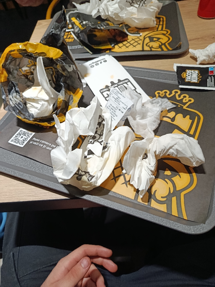The image displays a post-meal scene on a light-colored wooden table within a fast-food restaurant in the city of Unknown, Unknown