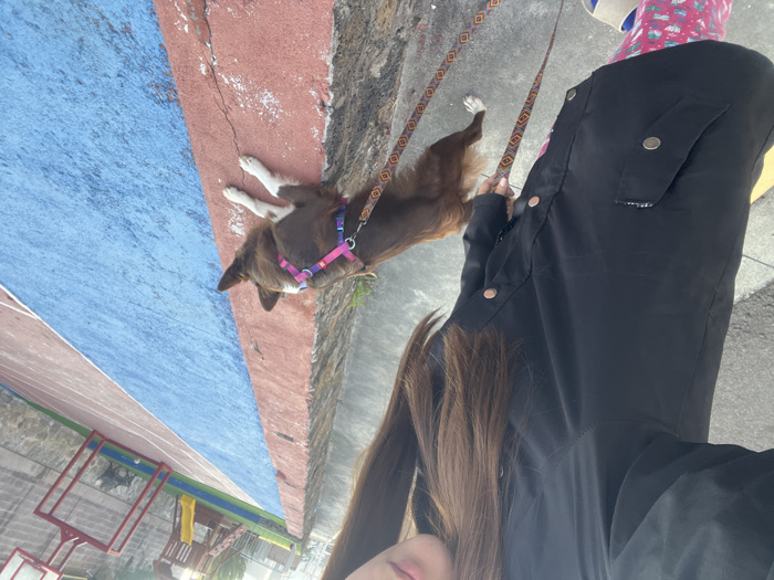 This image depicts an outdoor scene, reportedly in the city of Atapaneo, Mexico. The foreground features a partially visible female individual and a dog on a grey concrete surface, adjacent to a low wall. The female individual, partially obscured in the upper left, has long, straight dark brown hair. She wears a black, long-sleeved jacket with bronze-colored snap buttons and pocket flaps, along with pink patterned pants visible on her left leg. Her right hand is visible holding a multi-colored geometric patterned leash. Connected to the leash is a medium-sized, short-haired dog, brown with white markings on its chest and paws. The dog wears a pink and purple patterned harness. It is positioned with its front paws and chest resting on the red-painted top surface of a low concrete wall, looking down into an adjacent area. The wall, approximately 0.5 meters high, features a rough-hewn stone base and a worn, red-painted concrete cap that exhibits cracks and discoloration. Beyond this wall lies a multi-sport court with distinct blue and red sections. The blue section is immediately adjacent to the wall, transitioning to a red section further into the background. Both surfaces show signs of wear and staining. In the background of the court, playground equipment is visible, including a wooden structure with a yellow slide and stairs. A red metal goal frame, consistent with a soccer or handball goal, stands on the red court section. A dark-colored animal, possibly another dog, is faintly visible near the base of the goal. The sky appears overcast or hazy.