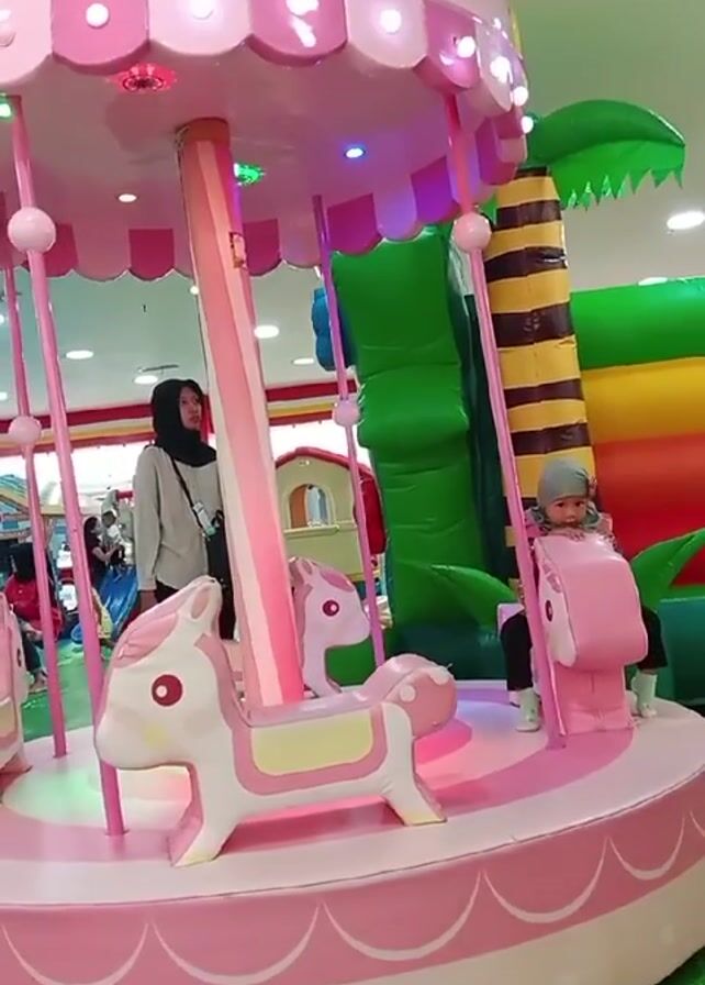 A small, pink, coin-operated carousel is shown in a playroom. A girl wearing a gray head covering sits on a pink horse. A woman wearing a hijab stands nearby. The playroom is brightly lit and includes a large, inflatable climbing structure with a slide, and a small playhouse. The carousel has a pink and white scalloped roof with colorful lights, and several white horses. Some other adults and children can be seen in the background. The carousel is in operation, rotating gently as the girl watches.