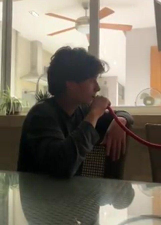 A young man with dark, wavy hair is seated at a glass table, inhaling from a hookah hose