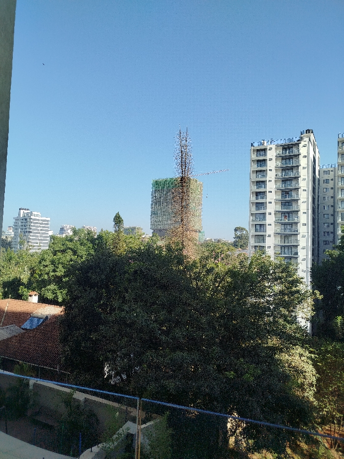 An urban scene features modern architecture, including tall, white apartment buildings with balconies and a building under construction encased in green netting with a crane nearby. Green trees fill the space between the buildings and in the foreground, partially obscuring a red-tiled roof of a smaller building. The sky is clear blue. A railing and plants suggest the view is from a balcony.