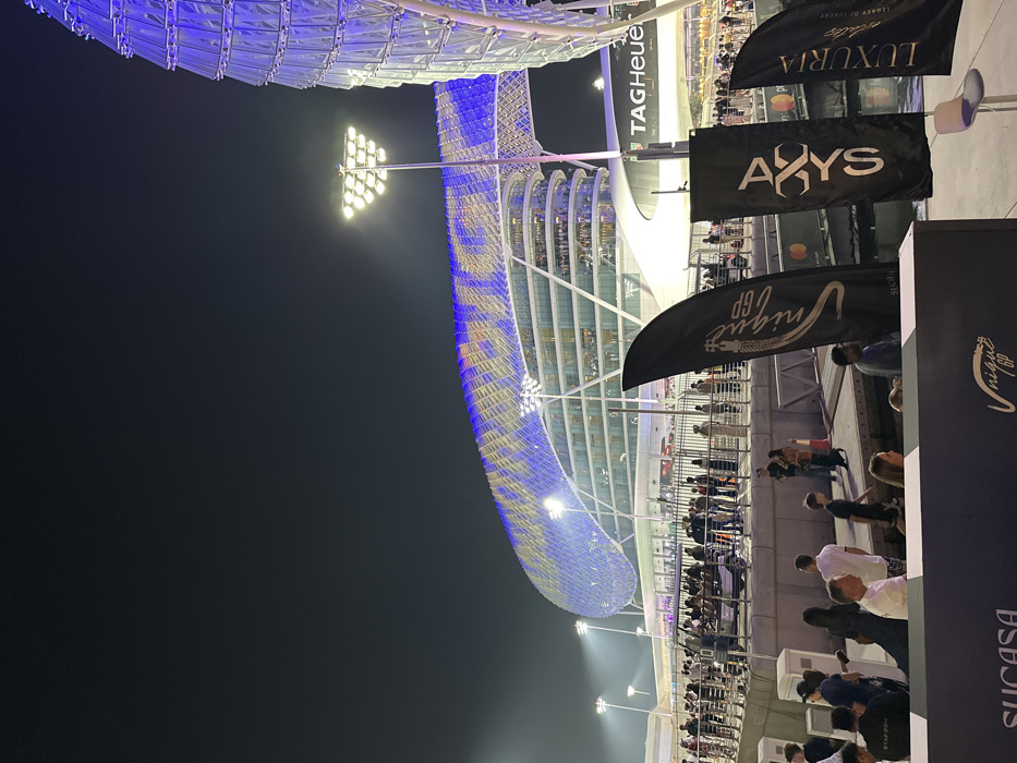 The image displays an outdoor night scene at the Yas Marina Circuit in Abu Dhabi, United Arab Emirates