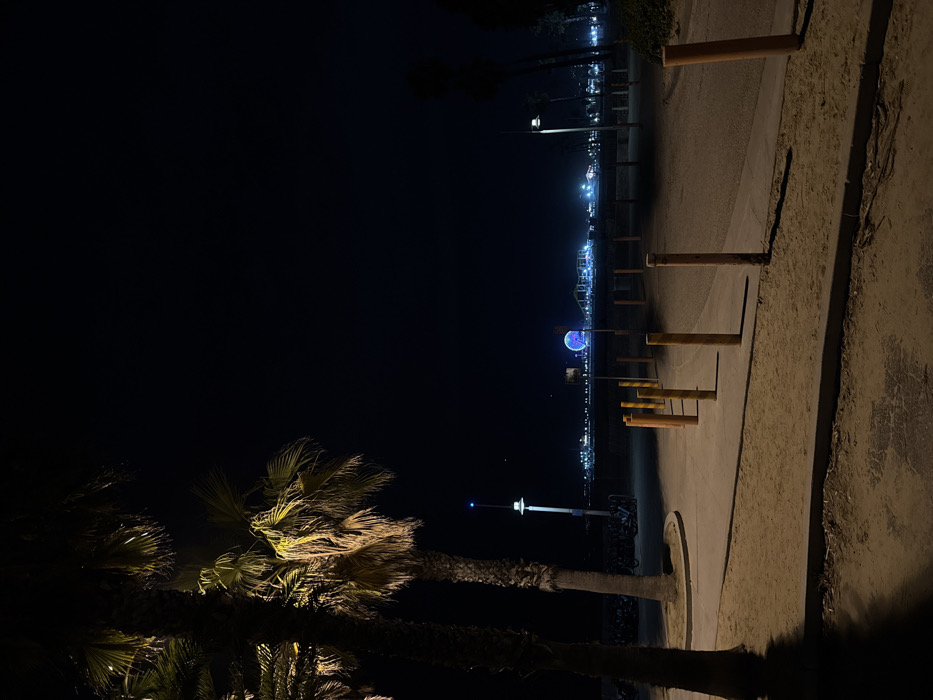 A dark, nighttime scene shows a boardwalk with evenly spaced bollards and a sidewalk to the right. Beyond the boardwalk, a Ferris wheel with blue lights is prominent. Palm trees are visible in the foreground, lit from below. Street lights line the background along what appears to be a waterfront. The image has a muted color palette due to the low light conditions.