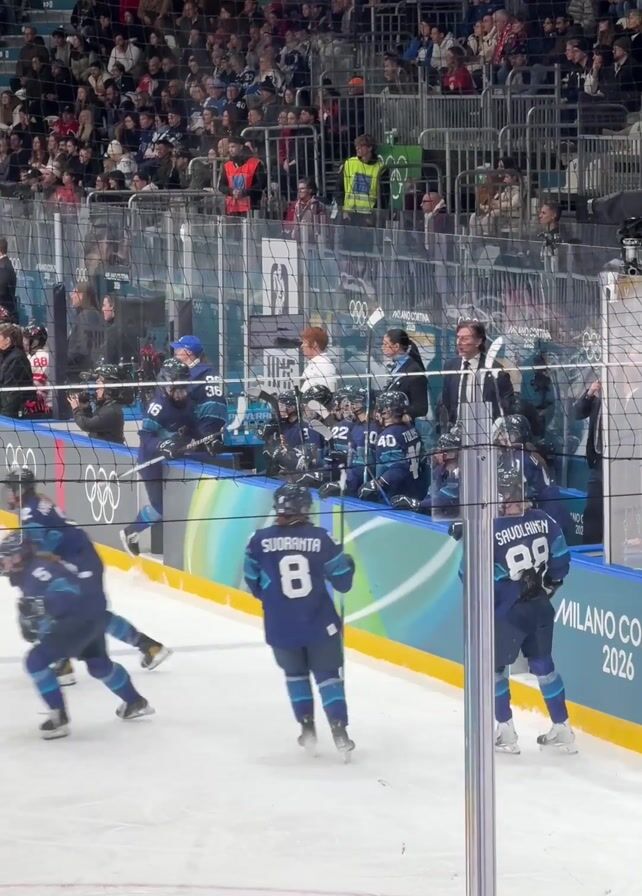 group of hockey players in blue uniforms on the bench during a game. The players are sitting and standing, some interacting with each other. In the background, a large crowd fills the stands. The rink is bordered by glass and netting, and there are Olympic rings and "MILANO CORTINA 2026" printed on the side.