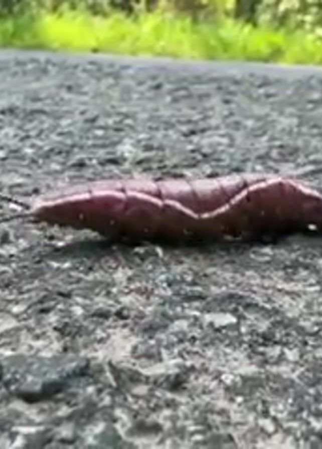 A close-up shot shows a brown and white striped caterpillar slowly crawling across an asphalt road. Trees and grass are visible in the background. A repetitive, rhythmic noise plays.