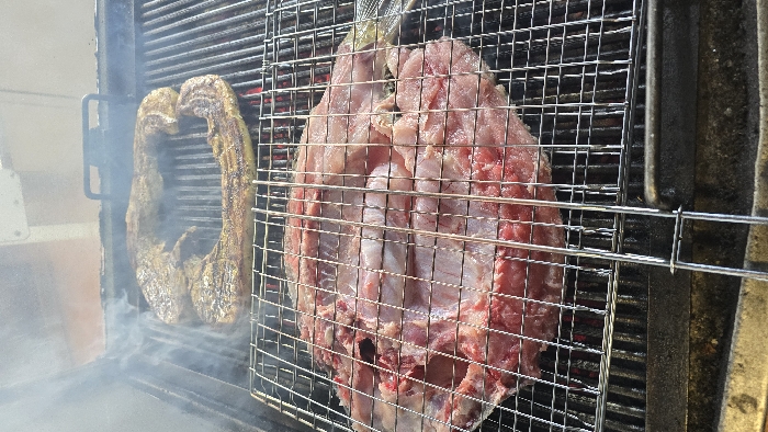 A close-up, high-angle view captures food cooking on a metal barbecue grill in Haskovo, Bulgaria. In the foreground, a large, butterflied fish, raw and pinkish-red, is secured within a rectangular, hinged metal grill basket, positioned directly over the grill grates. The fish's internal flesh is exposed, and its tail fin is visible on the right side of the basket. In the background, on the main grill grates, two elongated, curved pieces of seasoned meat, possibly pork belly or ribs, are cooking. These meat pieces exhibit a golden-brown, lightly charred exterior, suggesting they are partially cooked. Wisps of white smoke rise from the cooking food, particularly around the meat in the background. Red-hot coals or heating elements are visible beneath the metal grates, indicating active cooking. No individuals are visible in the scene. The immediate environment consists of the grill setup, with a light-colored, indistinct structure visible in the smoky upper background.
