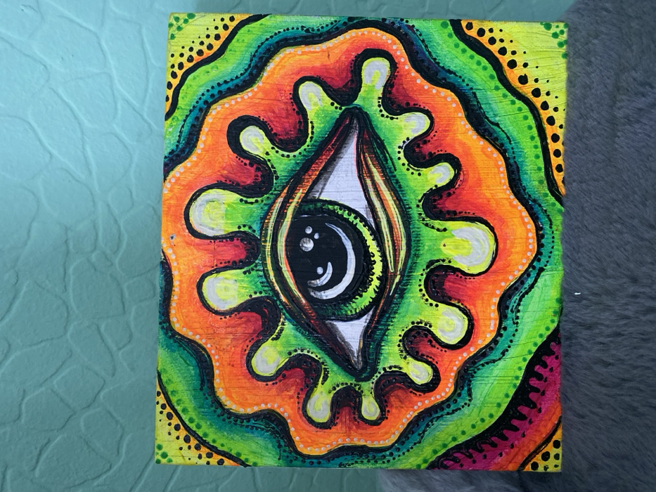 This image displays a square, brightly colored abstract painting resting on a dark gray, short-pile furry surface. The scene is set in an interior location within Perm, Russia. The painting's central motif is a stylized, almond-shaped eye, rendered with a prominent black pupil featuring a white reflection, a vibrant green iris, and a white sclera, all delineated by thick black outlines. Surrounding the eye are concentric, wavy bands of intense neon colors, including shades of green, yellow, orange, and red, accented with bright pink. These bands are outlined in black and contain small, contrasting dotted patterns. Irregular white or light yellow shapes, resembling drips or blobs, are interspersed within the colorful bands. Visible wood grain on the painting suggests it is executed on a wooden panel. The background behind the painting and the furry surface consists of a light teal wall with a distinct, irregular textured finish.