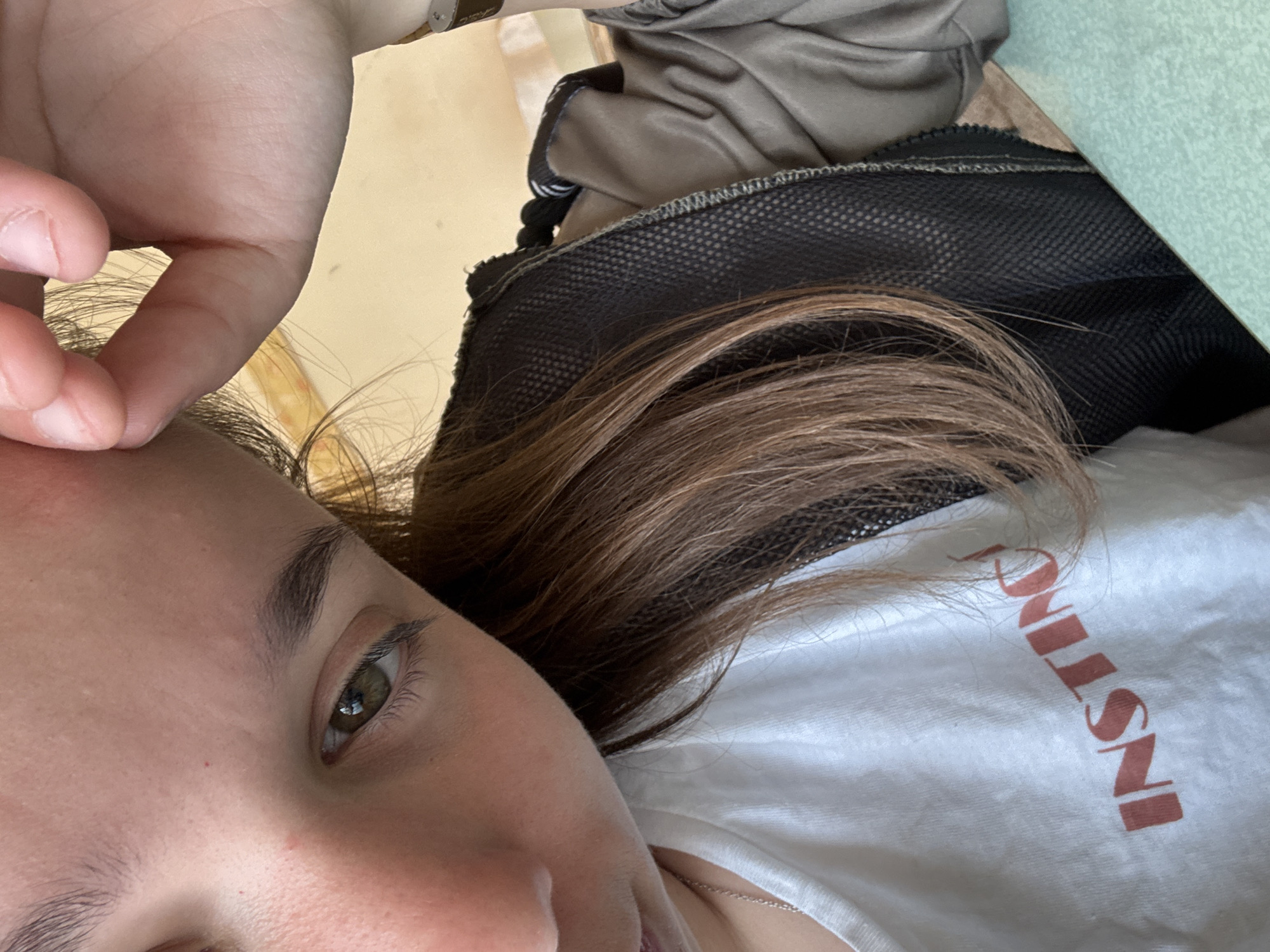 A person is holding their forehead with their hand in an indoor setting. They have brown hair and hazel eyes. They are wearing a white t-shirt with the word "INTRO" printed on it in brown letters. The background includes a beige-colored wall, a green pillow, and a black mesh fabric. The location is not discernible from the image.