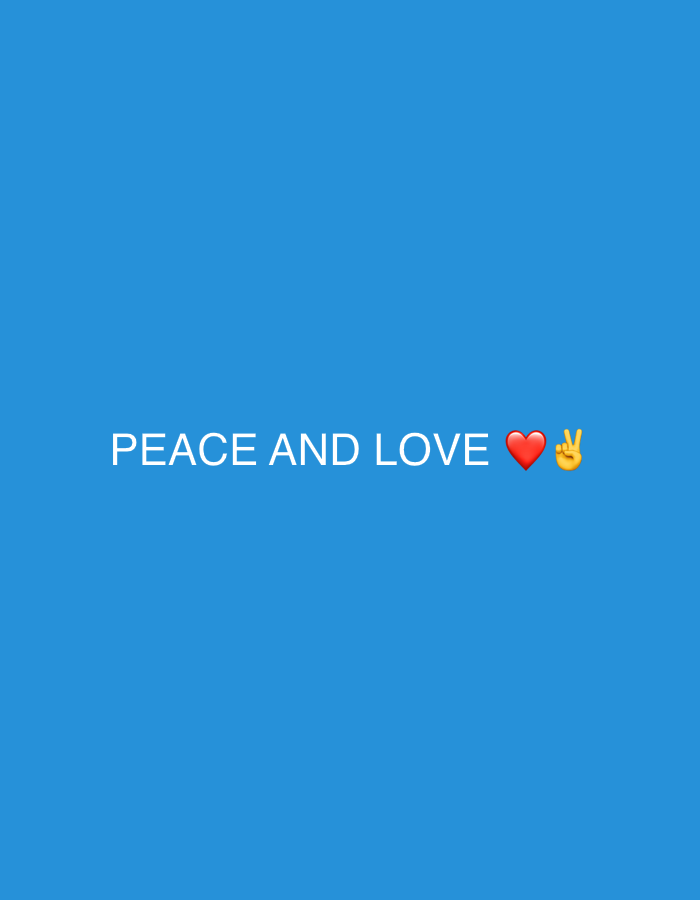 The scene depicts a digital graphic on a solid, medium-blue background. Horizontally centered in the lower portion of the frame are the words "PEACE AND LOVE" rendered in white uppercase letters. Immediately following the text are two emojis: a solid red heart symbol and a hand with a yellow skin tone displaying a V-sign, commonly interpreted as a peace symbol. No individuals, physical subjects, or tangible objects are present, and no actions or interactions are depicted within the visual content. This digital display is described as being located in the city of Dolni Chiflik, Bulgaria.
