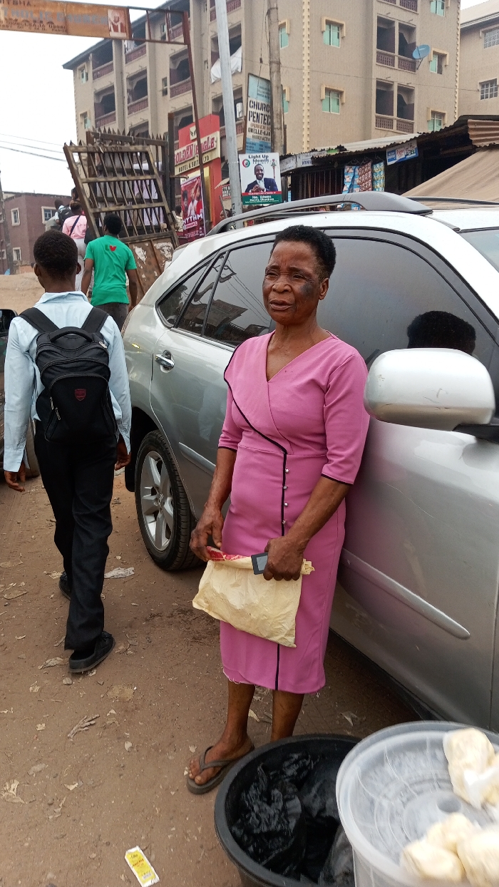 This image depicts a bustling street scene in Ogbunike, Nigeria. In the foreground, an elderly Black woman stands facing slightly left, leaning against the front passenger side of a silver SUV, identifiable as a Lexus RX. She wears a pink, knee-length dress with a V-neck, black trim, and six decorative buttons down the left bodice, paired with dark flip-flops. Her right hand holds a light-colored paper or plastic bag, with a dark smartphone partially visible within her grasp. A dark mark is present on her left cheek. To her immediate left, a young Black male walks away from the camera, wearing a light blue long-sleeved shirt, dark trousers, dark shoes, and a black backpack with red accents. Further in the background on the left, another Black male in a green t-shirt is partially visible, also walking away. The ground is unpaved, consisting of reddish-brown dirt and scattered debris, including a yellow wrapper near the lower right corner. Two plastic buckets are present in the lower right: a black one containing dark plastic bags and a clear one with a lid, holding several irregularly shaped, white substances. The background features multiple buildings, including a multi-story tan structure with balconies and windows, likely a hotel or residential building, with signs such as "GOLDEN EAGLE HOTEL & SUITE LTD" and "CHURCH OF PENTEC..." visible. A political poster featuring a man in a suit with the text "Light Up Anambra" is also visible. A large, wooden-sided truck or utility vehicle, potentially carrying passengers, is seen behind the walking man. Overhead power lines crisscross the sky, which appears overcast.