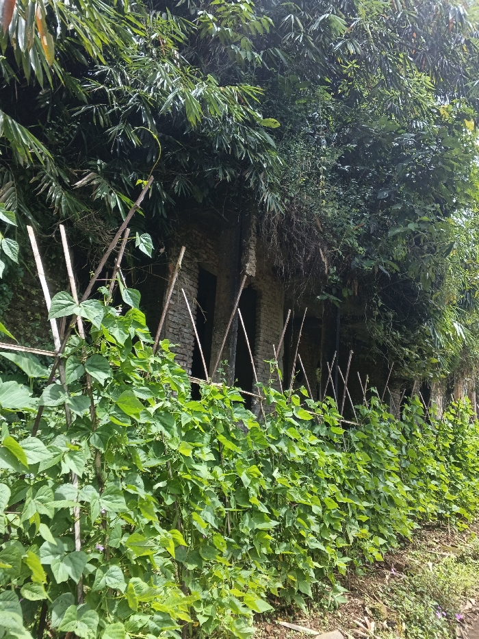 A row of vibrant green bean plants climbs up bamboo supports, creating a lush foreground. Behind them, an aging brick structure, likely a former wall or building, is heavily overgrown with dense foliage. The bricks are weathered and partially obscured by vegetation. A canopy of trees and bamboo tops the scene, casting shade and creating a wild, natural environment overtaking the man-made structure.