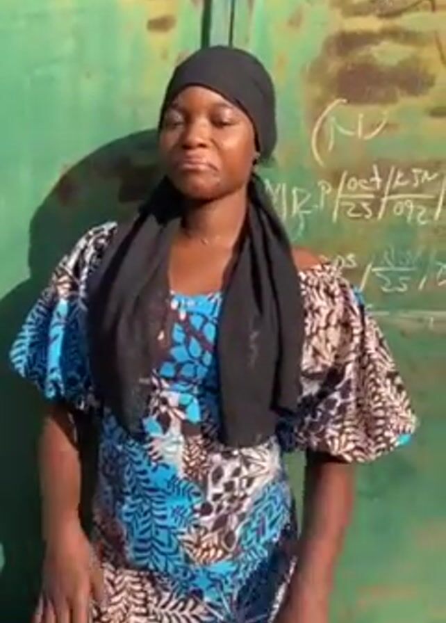 A young woman stands in front of a green metal door with writing on it. She is wearing a blue and white patterned dress with puffy sleeves and a black headscarf. She looks towards the camera with a neutral expression and gestures with her hands. The lighting is bright and the video appears to be shot outdoors.