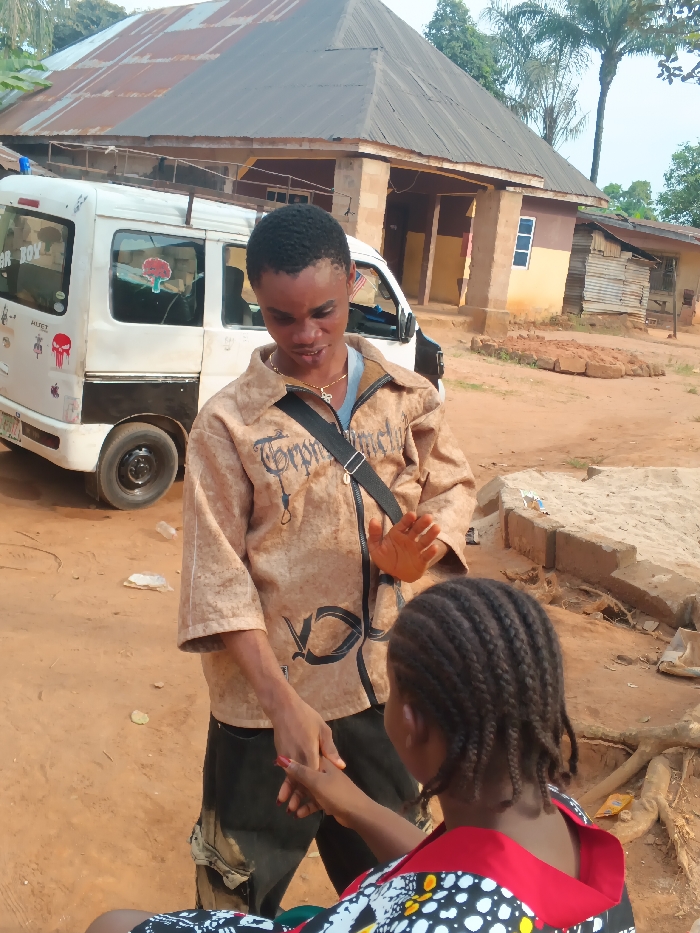 The image depicts an outdoor scene featuring two individuals interacting on reddish-brown dirt ground. In the center, a young adult male with dark hair wears a light brown, patterned long-sleeved shirt with "Troppmach" text, dark trousers, a black shoulder bag, and a gold-colored chain with a cross pendant. His right hand holds the left hand of a partially visible female, likely a child, positioned in the lower right foreground. The female has braided dark hair and wears a top with a red collar and a black, white, and yellow patterned body. The male's left hand is raised, palm open, as if in a gesture of speech or emphasis. In the background, a white commercial van with a black stripe is parked to the left. It features stickers including "SUGAR BOY" and a white skull with crossbones on its rear door. Behind the individuals and the van, a single-story building with a rusted, brown hip roof and brown and yellow-painted walls is visible. To the right of this building, a smaller structure constructed from corrugated metal sheets is present. Green foliage and palm trees are visible in the far background under a bright sky. The ground is uneven, comprised of dirt with scattered small debris. The location is an unspecified outdoor area.