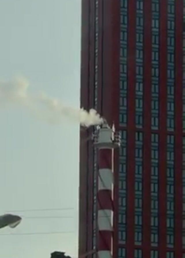 - "tall, thin chimney striped with red and white, emitting smoke from its top" by FM-4vIe53, licensed under CC BY 4.0