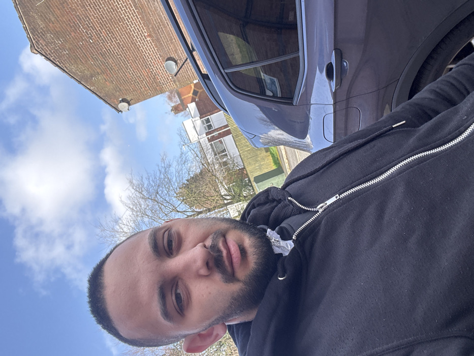 The image displays a male individual in the foreground, engaged in what appears to be a selfie, outdoors on a residential street in Preston, United Kingdom. The man possesses short dark hair and a beard, and is wearing a black zip-up hooded sweatshirt, revealing a white garment and a silver-colored chain or pendant beneath its opening. To the subject's right, a dark grey SUV with roof rails and tinted rear windows is partially visible, parked on the street. The background features a brick building with two satellite dishes affixed to its exterior wall. Further into the background, bare deciduous trees and additional residential structures are discernible, including one with white walls and another exhibiting patterned brickwork. A light-colored wooden fence demarcates a property line in the mid-ground. The scene is illuminated by natural daylight under a blue sky with scattered white clouds.