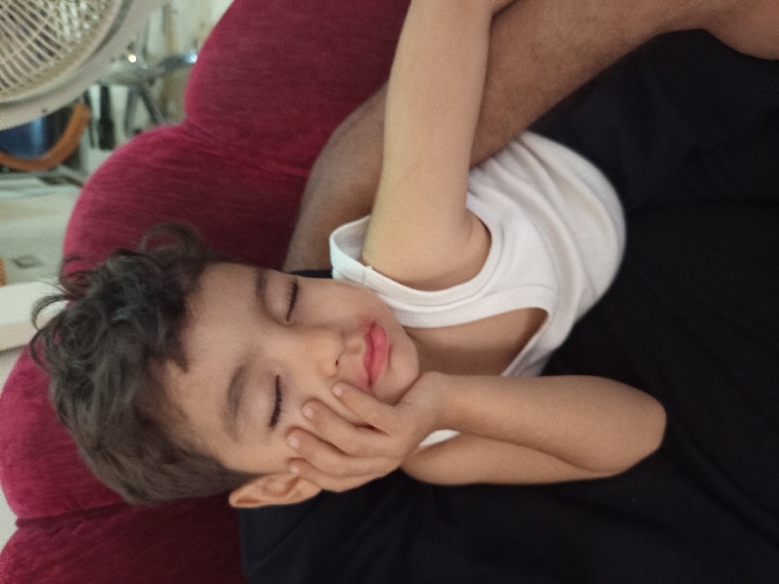 A young child with dark, curly hair and light skin is depicted resting indoors, eyes closed