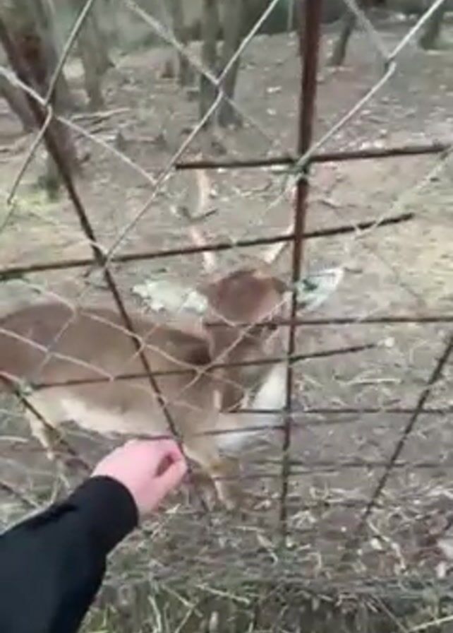 hand reaching through a wire fence to feed a deer