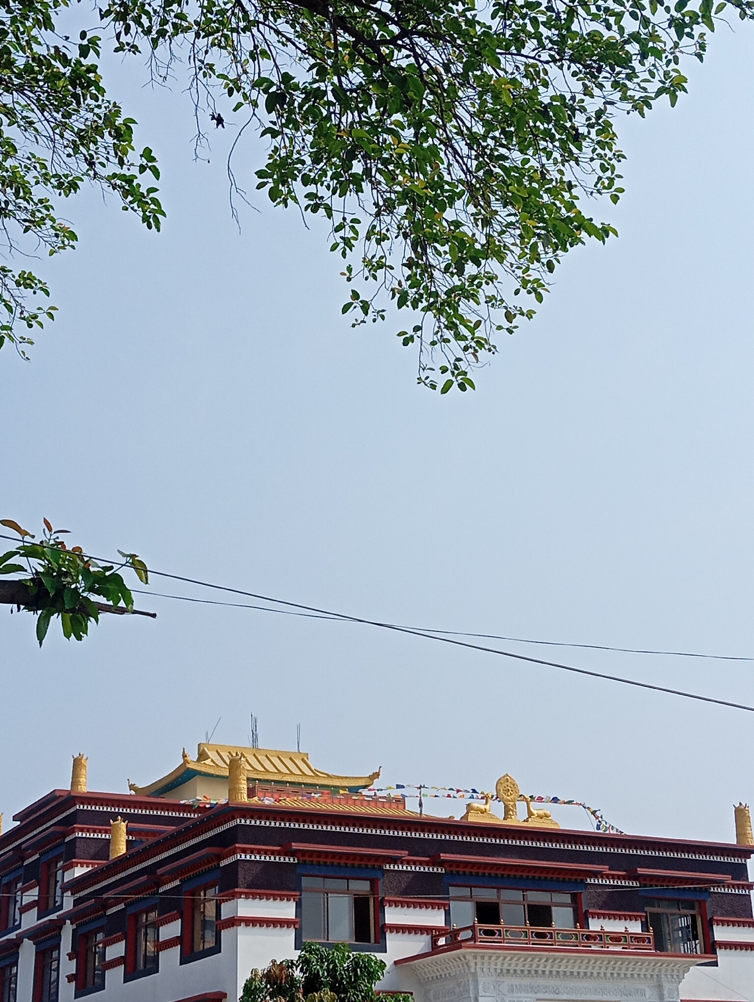Captured from a low angle, the photograph reveals a segment of the sky, partially obscured by tree branches, and a multi-tiered structure in लुम्बिनी साँस्कृतिक, Nepal. The building is characterized by a white base, transitioning into levels marked by dark red and black horizontal bands. Traditional architectural elements, including a golden roof, are visible. Golden sculptures are positioned on the roof. Power lines stretch across the lower third of the frame.