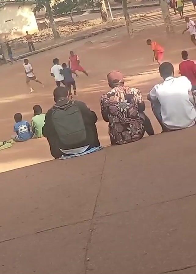 A group of people watch a soccer game played on a brown dirt field outside. The field is surrounded by trees and buildings. The spectators are sitting on a raised concrete area. In the soccer game, one team wears red, and the other wears white and navy blue. The game appears casual, and there are no referees visible.