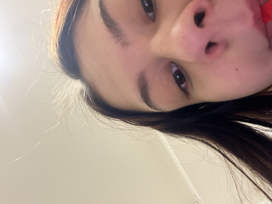 The image displays a close-up, low-angle portrait of a single individual, described as being located in Bankya, Bulgaria. The subject is a young female with dark brown hair, dark eyes, and visible freckles on her nose and cheeks. Her gaze is directed slightly upwards towards the camera. A red cylindrical object, consistent with a drinking straw, is positioned in her mouth, extending from the lower right quadrant of the frame. Her dark hair, partially obscuring the left side of her face, exhibits illuminated individual strands against a uniformly lit, plain, light-colored background, consistent with an indoor ceiling or wall.